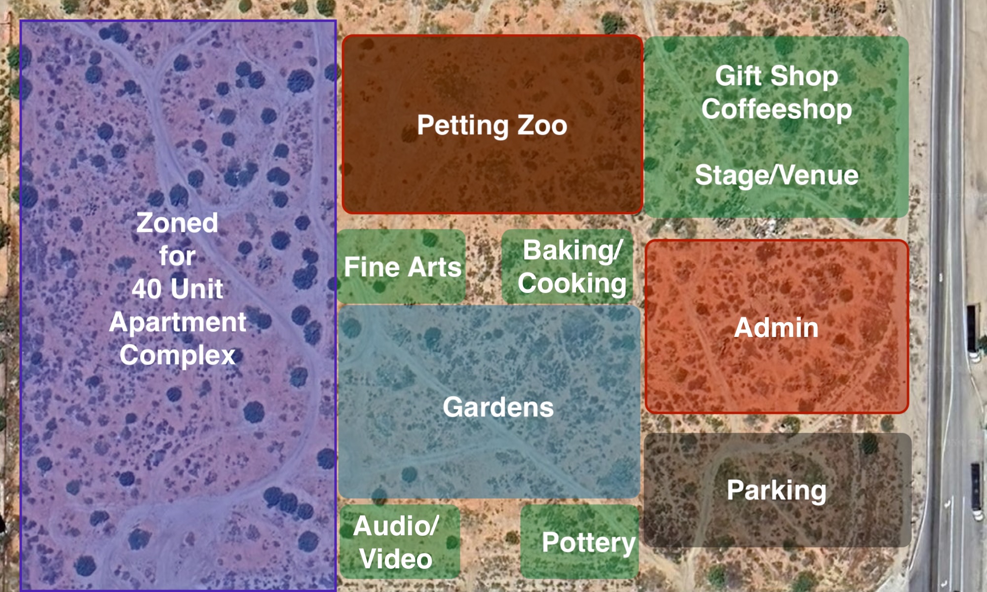 The western third of the property is one large lot zoned for a 40-unit apartment development. High functioning adults with special needs would be eligible for subsized housing.